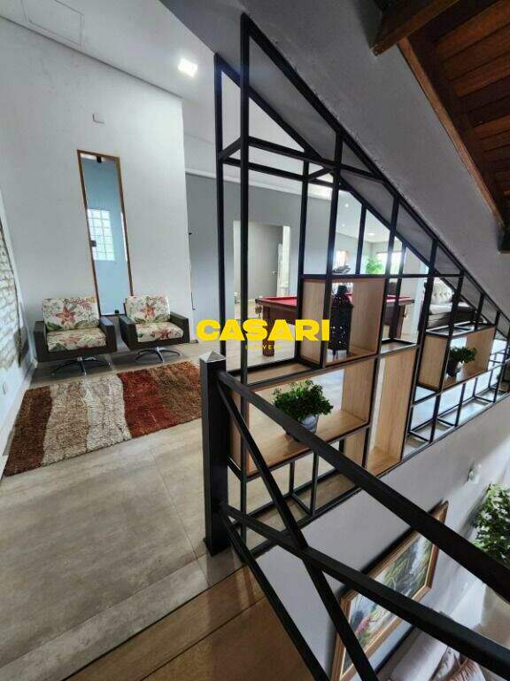 No mezanino multifuncional, há sala de TV, escritório, área de leitura, espaço para jogos com mesa de sinuca e área fitness equipada com esteira e bicicleta, todas com vista para o entorno.